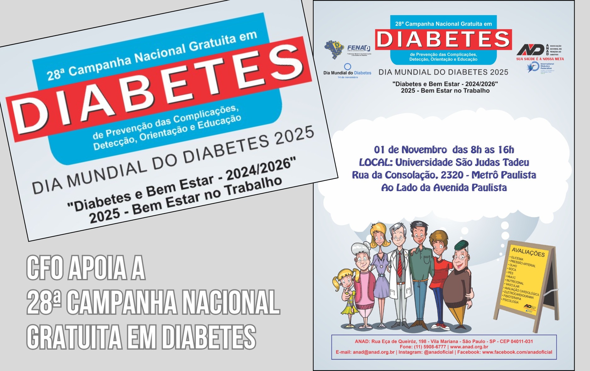 A campanha será realizada no dia 1º de novembro de 2025, das 8h às 16h, na Universidade São Judas Tadeu, em São Paulo (SP), com o tema: “Diabetes e Bem-Estar (2024/2026) – Ano 2025: Bem-Estar no Trabalho”.