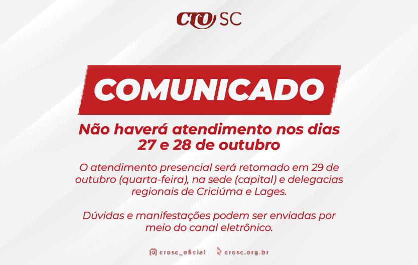 Informamos que não haverá atendimento nos dias 27 e 28 de outubro.