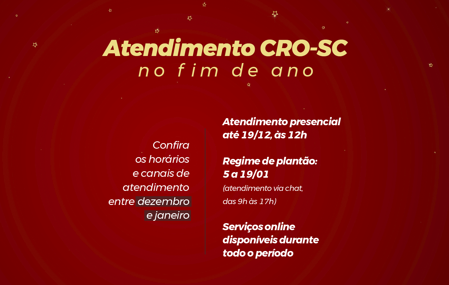 O Conselho Regional de Odontologia de Santa Catarina (CRO-SC) informa aos cirurgiões-dentistas, pessoas jurídicas e demais inscritos sobre os horários e formatos de atendimento durante o período de final de ano.