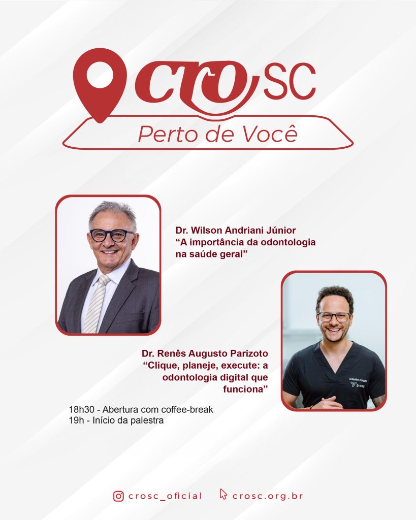 Nos três primeiros encontros, a programação contará com a participação do presidente do CRO-SC, Dr. Wilson Andriani Júnior, que ministrará a palestra “A importância da odontologia na saúde geral”, reforçando a integração da saúde bucal com o cuidado sistêmico dos pacientes. Também participa o Dr. Renês Augusto Parizoto, com a palestra “Clique, planeje, execute: a odontologia digital que funciona”, trazendo uma abordagem prática sobre planejamento, tecnologia e eficiência na odontologia contemporânea.