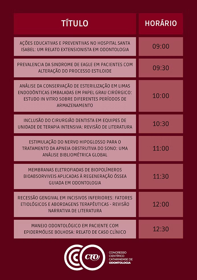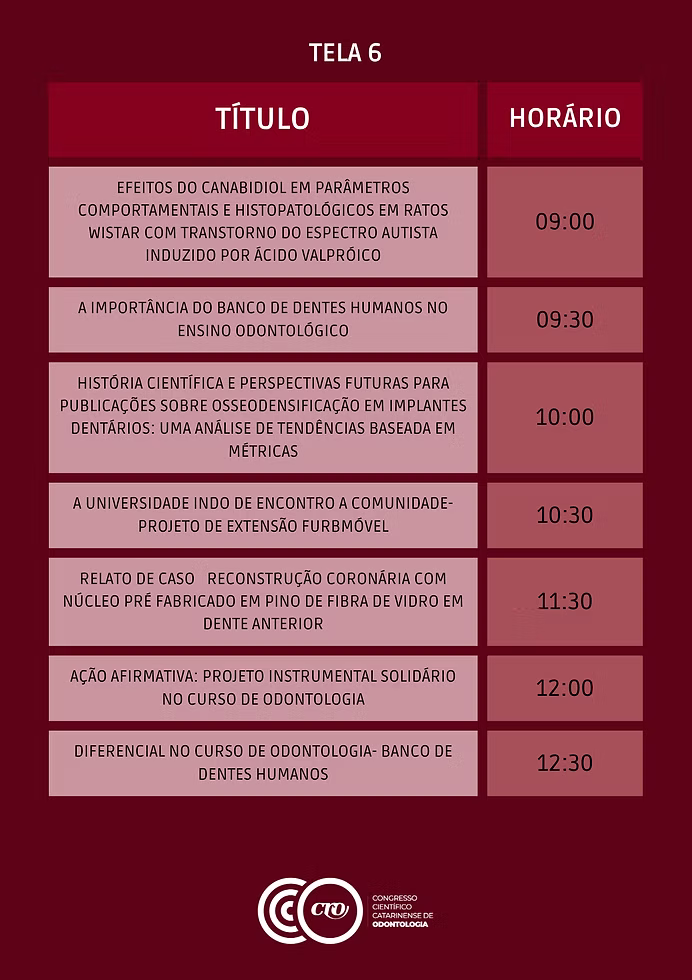 O Congresso foi idealizado para fortalecer a produção científica e incentivar a formação crítica dos futuros cirurgiões-dentistas. As atividades incluirão apresentações orais e painéis eletrônicos com trabalhos acadêmicos vindos de todas as regiões de Santa Catarina, além de palestras com dois dos principais nomes da Odontologia brasileira — Dr. Oswaldo Scopin e Profa. Dra. Maristela Lobo.