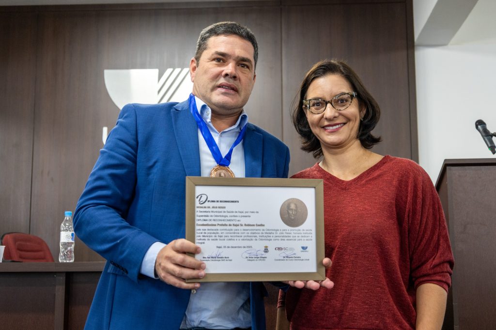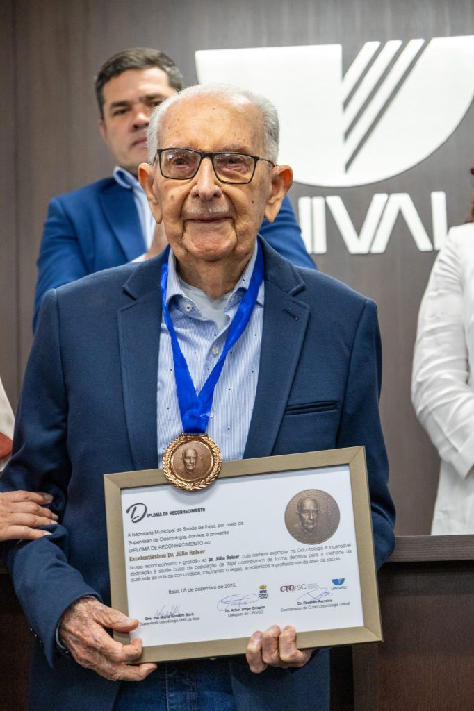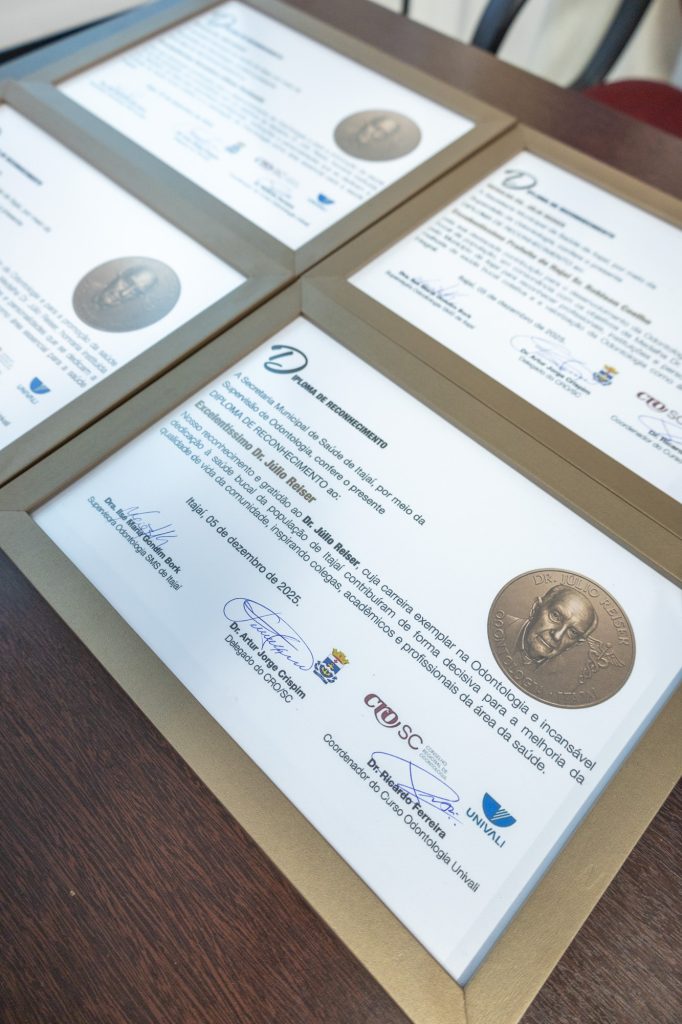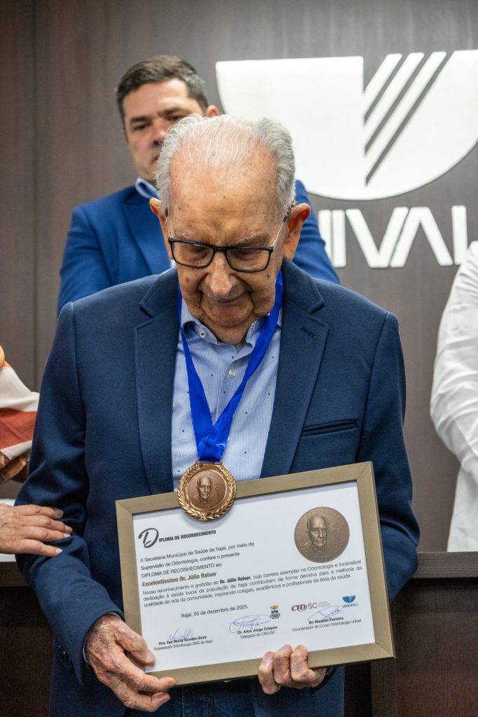 Ao receber a honraria, o prefeito de Itajaí, Robison Coelho, destacou os investimentos recentes do município na área da odontologia. “Itajaí avançou muito nos últimos meses: reformamos unidades, adquirimos novas cadeiras e equipamentos e ampliamos em 42% o número de profissionais. Receber essa medalha, especialmente na presença do Dr. Júlio Reiser, que é uma referência para nós, é uma grande honra.”