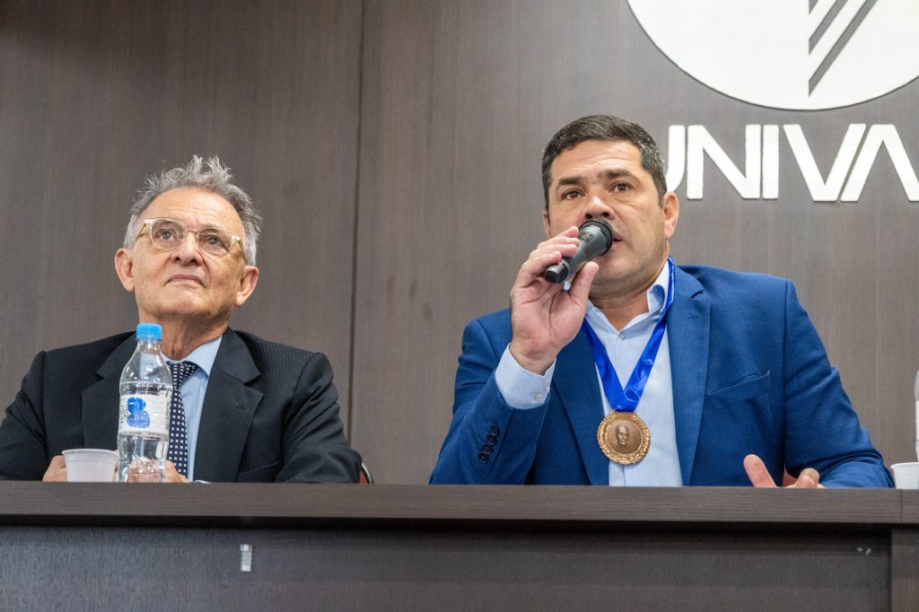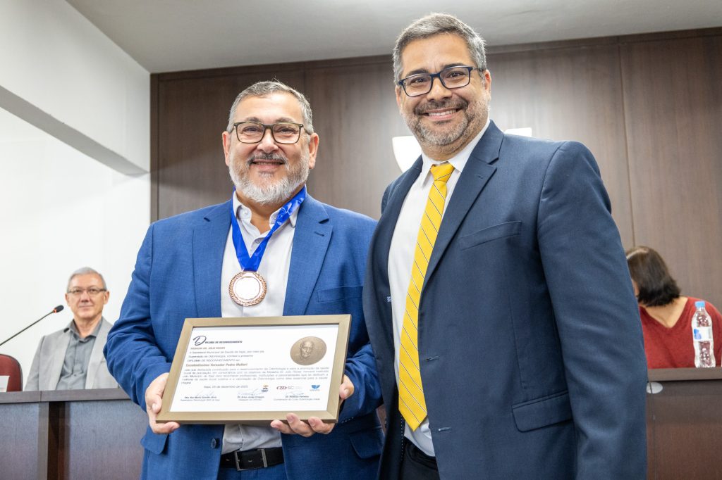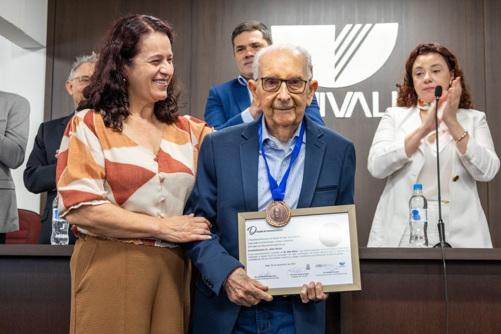 Um dos momentos mais solenes e emocionantes do encontro foi a entrega da Medalha Dr. Júlio Reiser, honraria instituída pelo Município de Itajaí com o propósito de perpetuar o legado de um profissional que marcou a história da Odontologia e da Saúde Pública na cidade e na região.