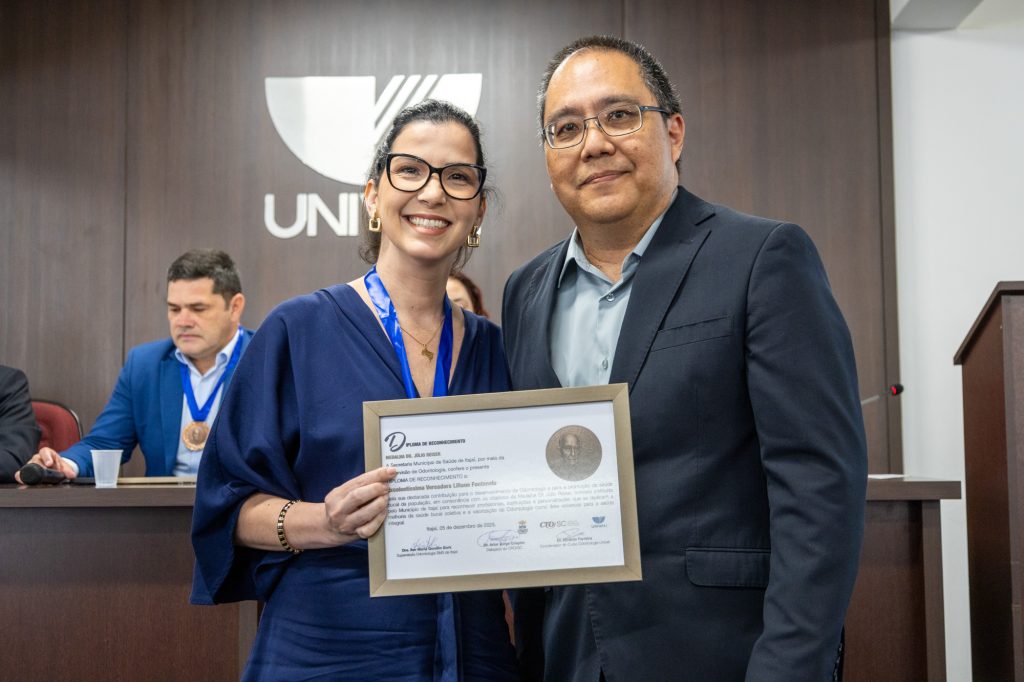 A solenidade de abertura contou ainda com a presença do prefeito de Itajaí, Robison Coelho; da secretária de Saúde do município, Dra. Mylene Lavado; da supervisora de Saúde Bucal da Secretaria Municipal de Saúde, Dra. Ilse Bork; da coordenadora de Saúde Bucal da Secretaria de Estado da Saúde de Santa Catarina, Dra. Fernanda Berretta; e do coordenador do Curso de Odontologia da Universidade do Vale do Itajaí (Univali), Dra. Daniela Carcerari, presidente da Associação Brasileira de Ensino Odontológico (ABENO) e Prof. Dr. Ricardo Ferreira, reforçando o caráter institucional e a integração entre as diferentes esferas da gestão pública e da formação acadêmica.